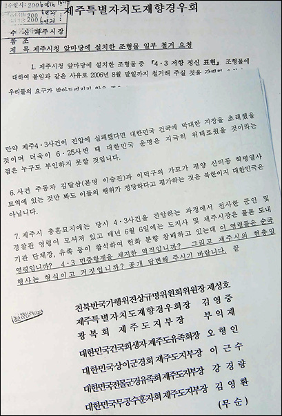 이에대해 김영중 재향경우회장은 "우리가 보는 것은 '4.3은 공산 폭동'이라고 본다"며 "지난 3일 제주에 강연차 내려온 제 교수를 만나 제주시청 조형물에 대해 이야기를 나누면서 공동명의로  '철거 요청'에 대해 민원을 내자고 제안한 바 있다"고 말했다.