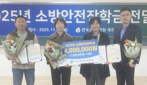 한국소방안전원 제주지부(지부장 김형기)는 24일 제주지역 소방안전원 회원 중 소방안전장학생으로 선발된 4명에게 장학금을 전달했다. 소방안전장학금은 소방안전원 회원에 대한 복리 증진 일환으로 소방안전 업무를 성실히 수행하는 안전원 소속 우수 회원이나 회원 자녀를 대상으로 장학금을 지급하는 제도다. 한국소방안전원은 지난 1982년부터 해마다 회원과 회원 자녀를 대상으로 소방안전장학생을 선발, 장학금을 지급하고 있다.김형기 제주지부장은 “소방안전에 최선을 다하는 회원들의 역량 강화를 위한 혜택을 늘릴 수 있도록 앞으로도 노력하겠다”고 말