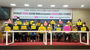 제주도민 1000여명이 여성농민으로 6.1 지방선거에 출마한 정의당 김정임 제주도의원 선거 비례대표 후보에 대한 지지를 공개 선언했다.전국여성농민회총연합 제주도연합은 20일 오전 11시 제주도의회 도민카페에서 기자회견을 갖고 “여성농민 김정임 도의원 후보를 지지한다”고 밝혔다.주최 측은 이날 기자회견에서 지지 선언에 참여한 1069명의 명단을 공개하기도 했다.이들은 먼저 “기후위기 시대 식량위기를 말하면서 농업의 중요성이 더 절실해지고 있다. 국민의 건강한 먹거리를 생산하는 농민이 얼마나 버틸 수 있을지 모르며 다원적 기능을 수행하