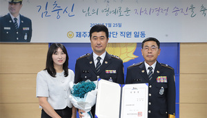 김충신 제주자치경찰단 기획홍보팀장이 자치경정으로 승진해 행정안전부 파견 길에 오른다.25일 제주특별자치도 자치경찰단은 아라청사 3층 참꽃마루에서 김 자치경정의 승진 임용식을 열었다.김 자치경정은 29일자로 행정안전부에 파견돼 이원화 자치경찰제 추진, 자치경찰제의 현장 개선 사항 발굴, 자치경찰과 지방행정 간 협력 방안 연구 등의 업무를 맡게 된다.오충익 제주자치경찰단장은 “제주자치경찰단이 성공적인 모델로 자리잡아 이원화 자치경찰제의 표준모델로 전국에 확산될 수 있도록 적극적으로 협력하고 노력해달라”고 당부했다.