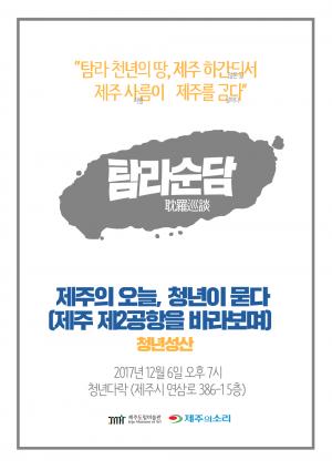 탐라순담[耽羅巡談] 마흔 번째 순서는 제주 청년들이 보는 제주의 정체성에 대한 이야기를 다룬다. 6일 오후 7시 제주 청년다락에서 청년성산이 ‘제주의 오늘, 청년이 묻다-제주 제2공항을 바라보며’를 주제로 탐라순담을 진행한다. 지난 2015년 제주 제2공항 입지로 발표된 서귀포 성산지역 마을청년이 마을청년의 시각으로 제2공항에 대한 이야기들을 풀어가는 1인미디어로 출발한 청년성산이 이 날 주인공이다. 이들은 “쓰레기, 하수도, 해양오염 등 제주도가 이미 환경수용력의 한계에 이르렀음에도 제주 제2공항 계획이 발표됐다. 변화의 정...