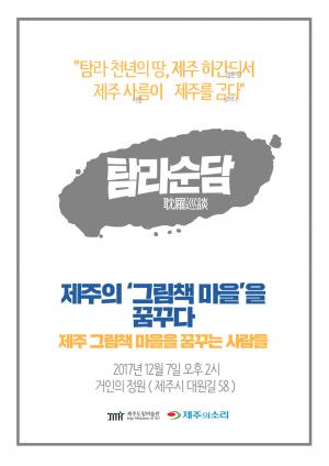 [제주비엔날레-탐라순담(耽羅巡談)] (41) 제주에서 그림책 마을을 꿈꾸는 사람들 제주비엔날레 2017 프로그램 중 하나인 ‘탐라순담’은 탐라 천년의 땅인 제주도의 여러 인물들과 함께 토크쇼·집담회·좌담회·잡담회·세미나·콜로키움·거리 발언 등 다종다양으로 제주의 현안과 의제에 대해 이야기(談)를 나누는 자리입니다. 누구나 주인공이자 손님이 될 수 있습니다.오는 12월 31일까지 약 50회에 걸쳐 ‘제주 하간듸’(많은 곳)서 ‘제주 사름’(사람)이 ‘제주를 곧는’(말하는) 탐라순담이 열립니다. 제주 사회를 이루고 있는 각계각층의...