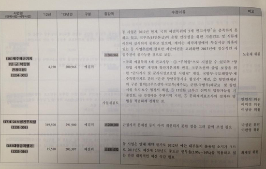 예결위 민주당 소속 위원들은 제주해군기지 2013년도 예산 2009억원을 전액 삭감하거나 사업재검토를 요구했다.