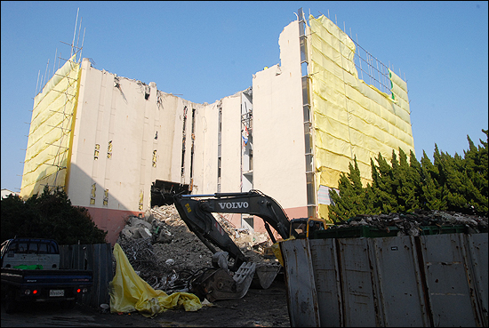 ▲ 14일 제주시 연동에 자리잡은 옛 신한백화점 건물의 철거작업이 이뤄지고 있다. ⓒ제주의소리 / 사진 = 문준영 기자
