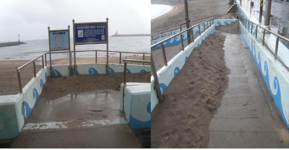 두 번째 사진은 제주시 “이호테우해변(해수욕장)”에 장애인지원협의회라는 자생단체가 장애인의 해변 접근을 위해 만든 경사로이다.