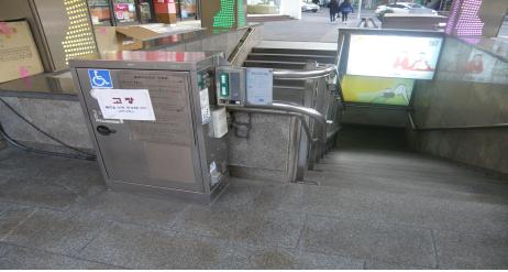 90년대 후반 장애인의 접근권 차원에서 만들어 진 이 리프트를 사용하는 장애인은 곤혹스럽다. 이를 사용하려면 지하상가 관리인을 유선 상으로 불러야 한다. 관리인이 열쇠를 꽂아 작동하여 지하로 내려가려면 족히 2분정도는 소요된다. ‘삐삐삐’ 기계음 소리가 울리는 동안 엄마품의 아이들,연인들이 신기하게 쳐다본다.