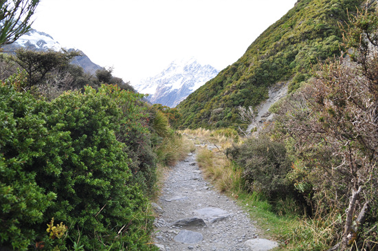 마운트 쿡 10개 트랙 중에서 체력에 맞는 길을 골라 천천히 걸으면 남반구 알프스의 아름다운 자태를 보고 느낄 수 있다. 많은 트래커들이 왕복 15Km의 후커밸리(Hooker Valley) 트랙을 선호한다. 마운트 쿡 빌리지를 넘어 타즈만 로드(Tasman Rd.)를 따라 올라가다 보면 캠프 사이트가 나오고 여기가 바로 후커 밸리 트랙의 출발점이다. 트레일은 정면에 마운트 쿡을 보며 후커 호수까지 이어지며 급경사가 없는 거의 완만한 코스이다.