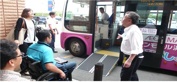 아래의 다른 저상버스 이용사진은 우리 일행이 대형마트를 이용하고자 승차하는 버스인데 대형마트를 이용하는 시민들을 위한 셔틀버스이다. 장애인을 소비자로 인식하고 셔틀버스를 유니버설 디자인인 저상버스로 설계한 것이다.
