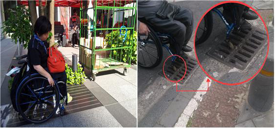 # 휠체어 장애인, 유모차, 지팡이를 짚은 노인들이 보행하다가 많이 걸리고 다치게 하는 배수로 덮개의 경우 간격이 촘촘해 배수구를 지나가는데 안전하도록 하고 있다.오른 쪽 사진은 제주시의 인도에 있는 배수로 덮개로 휠체어의 이동을 방해함은 물론 위험에 노출되어 있다.