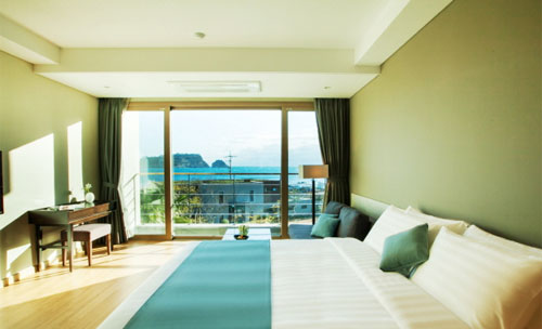 전 객실에서 바다를 바라볼 수 있도록 고려한 설계가 호텔 섬오름의 자랑이다. 또한 객실은 자연친화적인 느낌이 나도록 원목을 주소재로 사용했다.