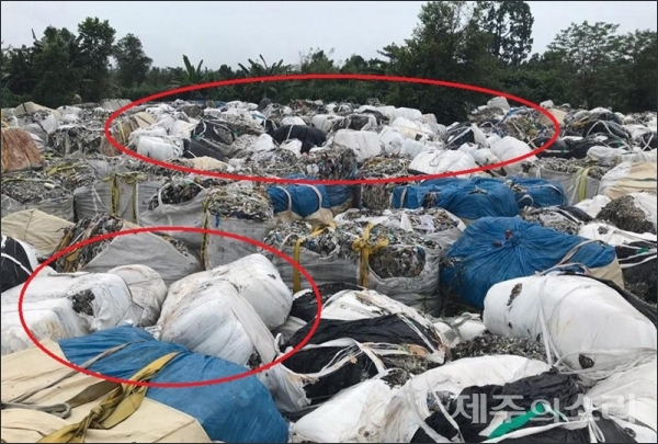 필리핀에 수출된 쓰레기. 제주도와 제주시는 제주에서 반출된 쓰레기는 모두 랩핑(빨간 원)됐다는 입장이다.ⓒ제주의소리 자료사진