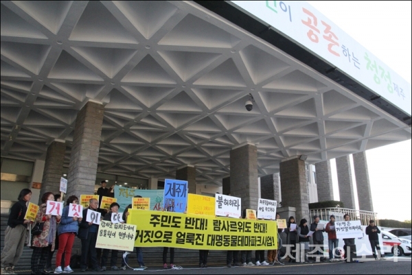 선흘2리 마을회(반대)와 선인분교 학부모회, 선흘2리 대명제주동물테마파크 반대대책위원회는 10일 오후 2시 제주도청에서 집회를 갖고 “제주도는 수많은 불법과 거짓이 드러난 동물테마파크 사업을 당장 불허해야 한다”고 촉구했다.