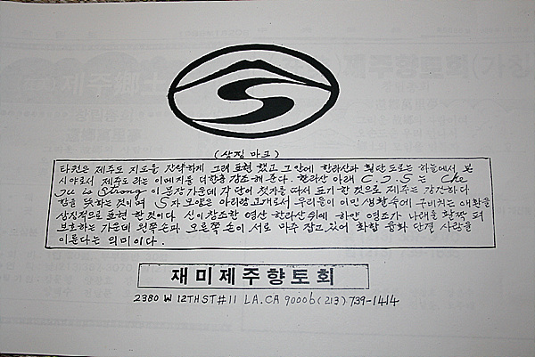 지금까지 쓰고 있는 LA제주향토회의 상징마크(사진)도 직접 그가 제작했다. 그가 직접 만들고 작성한 뜻이 자못 의미심장하다.