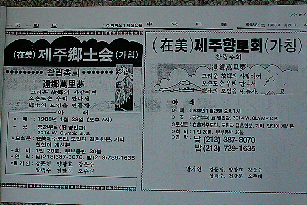 이 모임을 주도한 이는 아래 신문광고 발기인 명단에서 보이듯 강문행, 양창효, 강운수, 양택수, 전달문, 오주태 씨 등 6명이다. 이들이 어느 날 함께 식사하다가 “LA에 제주 출신이 많은 것 같은데 한번 모여보자”고 의기투합했다. 혹시나 하면서 신문광고를 내 봤는데, 결과는 대성공이었다.
