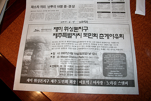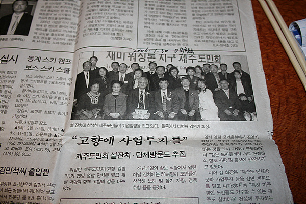 저녁 7시 북버지니아에 있는 한국식당 ‘설악가든’. 재미워싱턴지구 제주도민회 임원들이 모였다. 100만 제주인 네트워크 취재를 온 필자와 만나기 위한 이유도 있지만, 이번 탐라문화제 행사에 참여했던 이호석 회장 일행의 보고를 듣기 위해서다.
