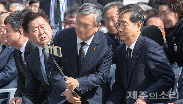 셀카봉에 휴대전화를 설치한 한 인사는 묵념 도중 추념식장에 난입해 한 총리 옆에서 사진촬영을 시도했다. 이를 오영훈 도지사가 막아서면서 실제 촬영으로 이어지지는 않았다.