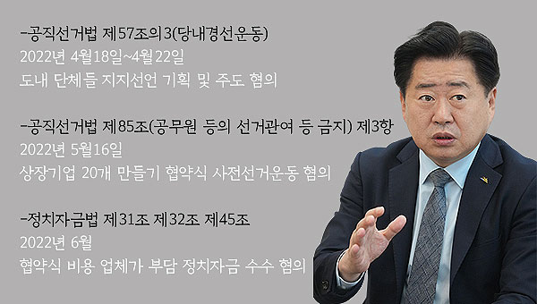 검찰은 오 지사가 2022년 5월16일 상장기업 공약 행사에서 단체를 동원해 사전 선거운동(공직선거법)을 하고 이에 따른 비용 550만원을 대납(정치자금법)하도록 한 것으로 보고 있다.