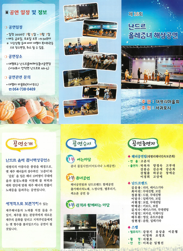 서귀포시 안덕면 대평리마을회(이장 김창남)는 오는 5일부터 9월 7일까지 매주 금·토요일 오후 7시 30분, 대평포구 공연장에서 ‘제16회 난드르 올레좀녀 해상공연’을 개최한다.