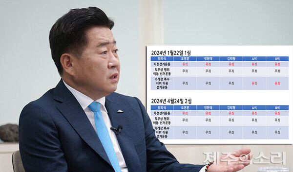 증인신문에 많은 시간이 소요되면서 올해 1월22일 1심 선고가 이뤄졌다. 오영훈 지사 벌금 90만, 정원태 본부장 벌금 500만원, 김태형 특보 벌금 400만원, A씨는 징역 6월에 집행유예 2년, B씨는 벌금 300만원에 548만2456원 추징 등이다.