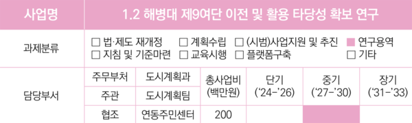 연동 종합발전계획에 따른 해병대 9여단 이전 및 활용 타당성 확보 연구는 2027년부터 2030년까지 중기 목표로 계획됐다. 구체적 계획안은 없지만 연동 발전을 위해 시급히 추진해야 할 사업으로 분류했다. 투입 예산으로는 2억원이 책정됐다.