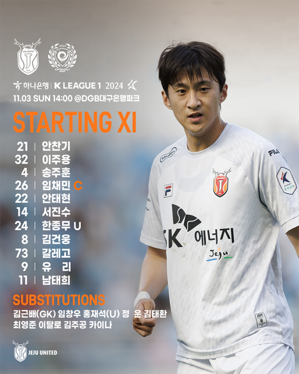 제주는 3일 오후 2시 DGB대구은행파크에서 열린 K리그1 2024 36라운드 원정경기에서 김주공이 멀티골 활약을 펼치면서 대구와 2대2 무승부를 기록했다.