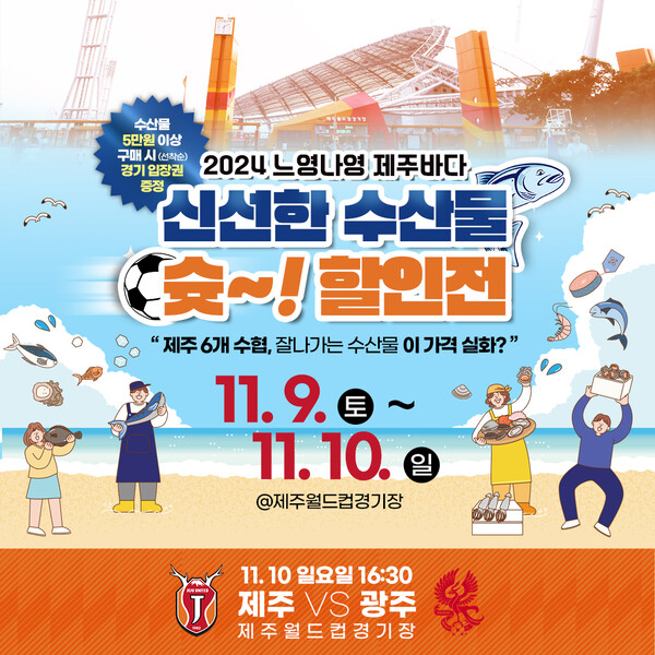 마지막 홈경기에 맞춰 제주는 오는 9일부터 10일까지 ‘2024 느영나영 제주바다 신선한 수산물 슛-할인전’을 진행한다.