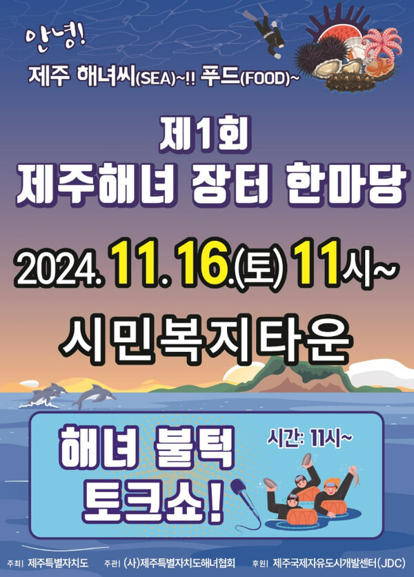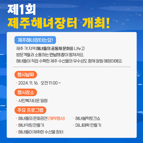 제주특별자치도와 제주도해녀협회(회장 김계숙)가 오는 16일(토) 오전 11시 제주시 시민복지타운 일원에서 ‘제1회 제주해녀 장터 한마당’을 개최한다.
