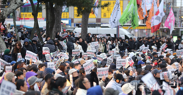 연대회의는 “헌법재판소는 헌법과 민주주의를 유린한 윤석열을 대통령직에서 파면해야 한다. 수사기관은 내란 수괴 윤석열과 가담자들을 구속 수사하고 법의 심판대에 세워야 한다. 탄핵 가결은 국헌문란, 내란세력 심판의 시작일 뿐이다. 민주주의와 헌정 질서가 회복되는 그 날까지 도민과 함께 촛불을 들겠다”며 즉각 퇴진을 촉구했다.