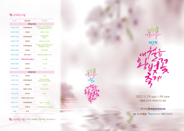 김태헌 애월읍장은 “애월의 아름다운 벚꽃과 함께하는 특별한 순간을 선사하기 위해 다양한 문화공연과 체험 프로그램을 준비했다”며 “가족, 친구, 연인과 함께 축제장에 방문해 잊지 못할 봄날의 추억을 만들어 가시길 바란다”고 말했다.