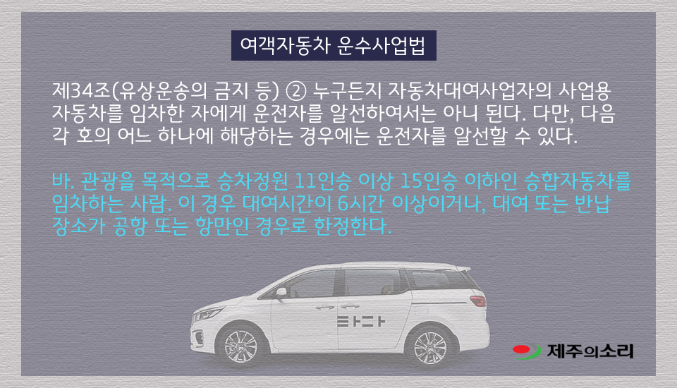하지만 기존 운수업계 입장에서는 영업권과 생존권과 직결된 사안이다. 특히 택시와 렌터카 이용률이 높은 제주에서는 업계의 충격이 더욱 크게 다가올 수밖에 없다.