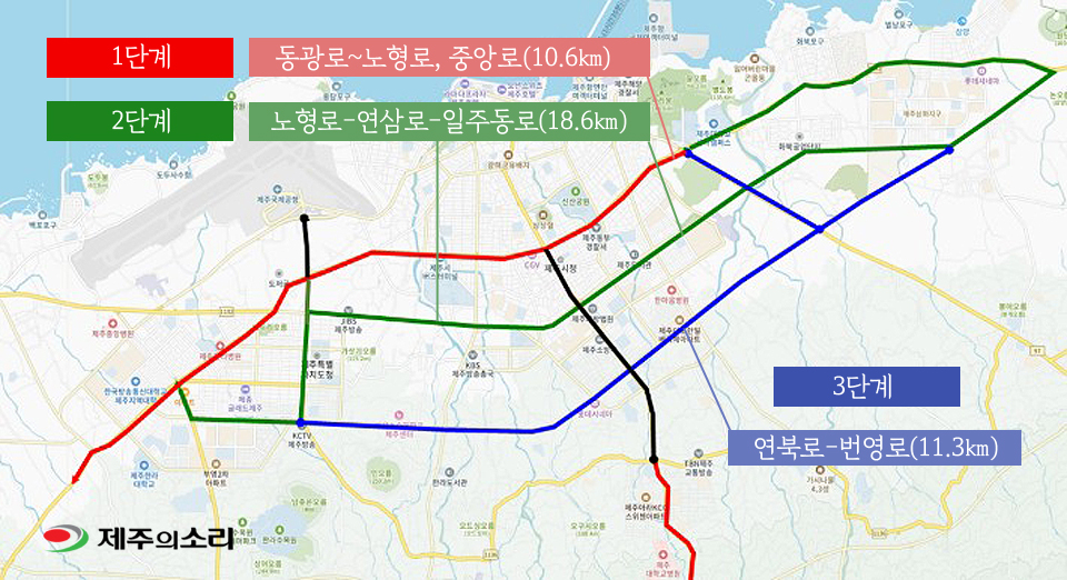 2단계는 노형로에서 연삼로를 거쳐 일주동로로 연결되는 18.6km 구간이다. 2029년까지 744억원을 투입한다. 3단계는 연북로에서 번영로까지 11.3km, 공사비는 452억원이다.