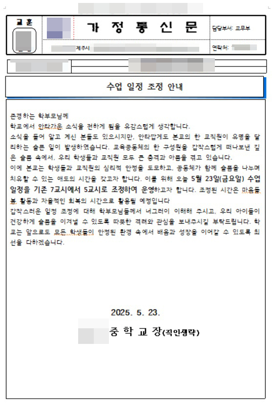 지난 22일 교사가 숨진 채 발견된 학교는 학생과 교직원 심리적 안정과 애도의 시간을 갖기 위해 23일 수업 일정을 기존 7교시에서 5교시로 조정했다.