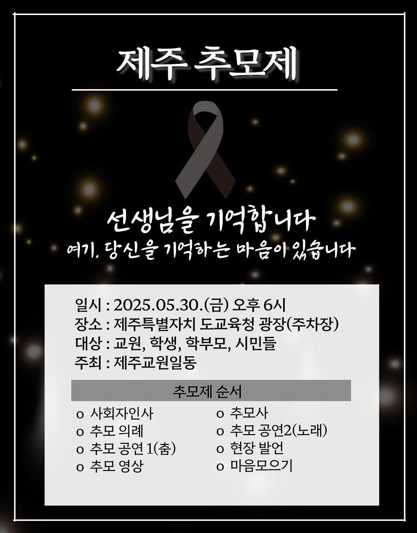 제주 사망 교사 추모제가 30일(금) 오후 6시 제주도교육청 본청 주차장에서 열린다. 이번 문화제는 제주지역 6개 교직단체가 공동 주최한다. 제주교총, 전교조 제주지부, 제주교사노동조합, 제주실천교육교사모임, 좋은교사운동, 새로운학교네트워크가 함께 연다.