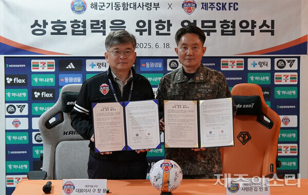 구창용 제주SK 대표이사와 김인호 기동함대사령관이 지난 18일 제주월드컵경기장에서 만나 체결한 협약에 따라 두 기관은 스포츠 활성화와 군 장병 여가 활동 지원 등을 협력하기로 했다.