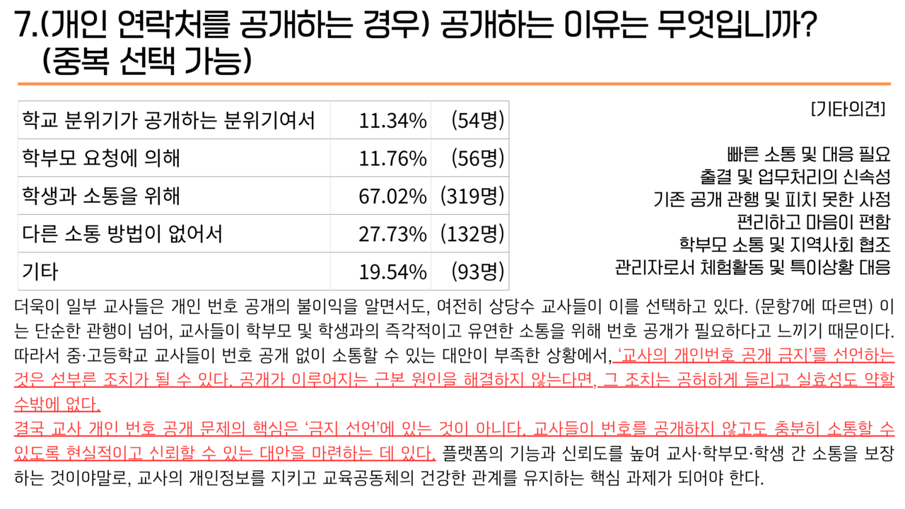 또 “교사 개인 연락처 노출 방지를 위한 지금까지의 대안은 압도적 지지를 받고 있는게 없다. 어떤 대안이 실효성 있는지 면밀히 검증해야 한다는 것”이라며 “단순히 번호 공개 금지 여부만을 둘러싼 이분법적 논의에서 벗어나 실질적 소통 플랫폼을 구축해야 한다”고 강조했다.