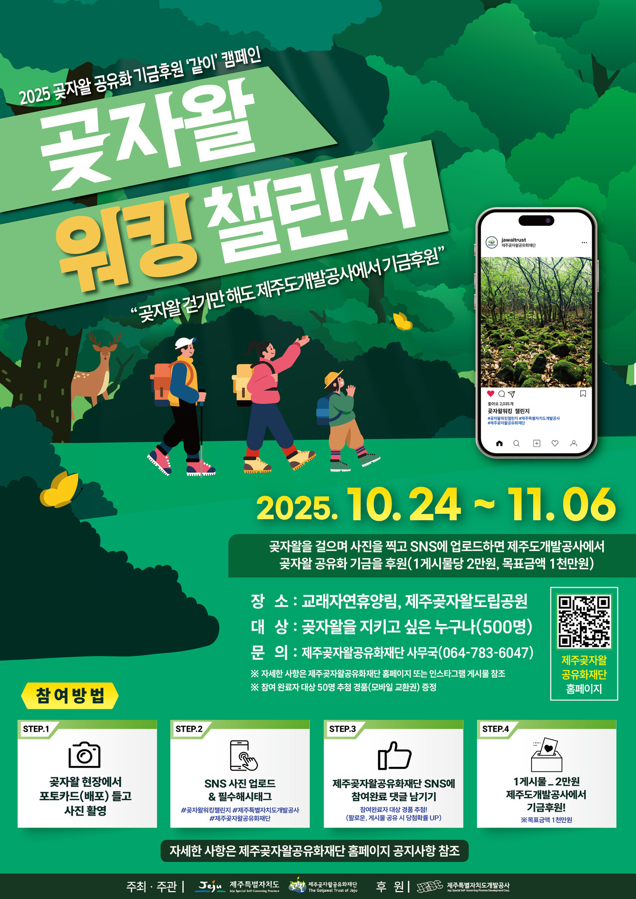 제주곶자왈공유화재단(이사장 김범훈)은 오는 24일부터 11월 6일까지 곶자왈을 걷기만 해도 곶자왈 공유화(매입) 기금을 기부하게 되는 ‘2025 곶자왈 워킹 챌린지’를 개최한다.