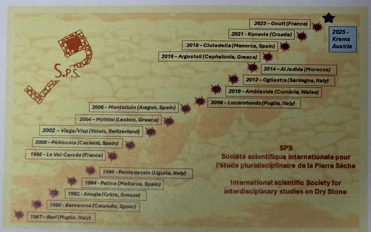 S.P.S.(Society Scientifique Internationale Pour Ietude Pluridisciplire de la Pierre Seche-drystone) 국제메쌓기학회는 메쌓기 돌담의 조사, 보호 및 보존을 위해 일하는 학자, 단체 및 석공들을 하나로 모으는 구심점 역할을 하는 유네스코의 국제단체