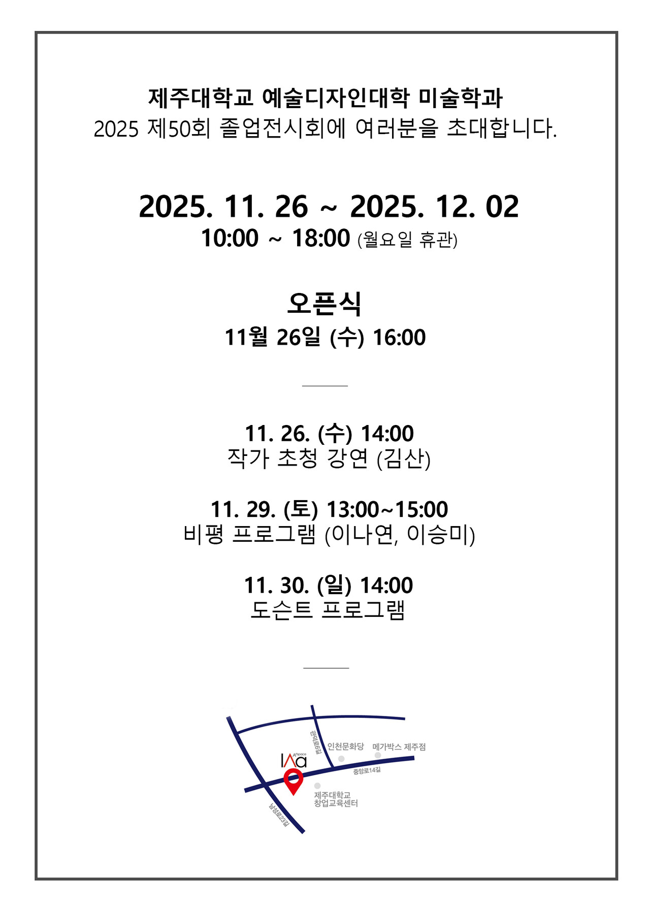 오픈식은 26일 오후 4시 진행되며, 관람은 오전 10시부터 오후 6시까지 가능하다. 월요일은 휴관일이다. 제주대 미술학과는 “관람객의 소중한 관심과 시선은 학생들에게 큰 힘이 된다. 전시 주제가 의미를 잃지 않도록 많은 관심과 소중한 발걸음 부탁드린다”고 말했다.