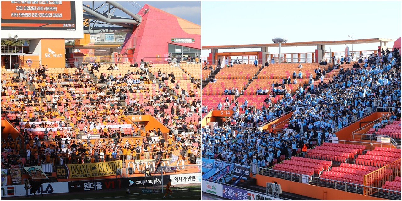 23일 오후 제주월드컵경기장. 2등 강등권 탈출을 건 이른바 ‘멸망전’이 펼쳐지자, 관중석은 주황빛 물결과 함성으로 요동쳤다. 이날 경기에는 총 9246명의 관중이 입장했으며, 그 중에는 대구에서만 1000여명의 원정 팬들이 찾아와 맞대결의 긴장감을 한층 끌어올렸다.