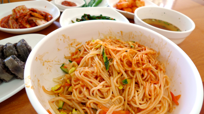 그런데 이런 진하고 개운한 국물과 고명에, 삶아진 국수 면발이 맛이 없다면 그야말로 맥이 빠질 터 이 집 면발 괜찮다. 알맞게 삶아졌고 참 쫄깃하다. 이 쫄깃한 면발은 특히 비빔국수를 낼 때 그 진가가 나온다. 쫄깃한 면발에 올린 고명이라고는 채 썬 오이. 데친 콩나물, 볶은 당근, 양파뿐인데 새콤달콤한 양념장과 더불