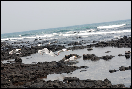 우리 가족이 이곳으로 거처를 옮기기 이전부터 아이들은 이 현무암 대지 위를 걷는 것을 좋아했다. 물웅덩이 속을 걸어 다니는 고둥, 바위틈에서 얼굴을 빼곡히 내밀면 주변 눈치를 보는 방게, 부지런히 어디론가 걸어 다니는 갯강구, 바위에 붙어서 꿈쩍도 하지 않는 군부, 그 어느 것도 아이들 눈에 신기하지 않은 게 없다. 돌 위에 터를 잡고 사는 이들은 갈매기와 더불어 망장포가 우리 아이들에게 선물해준 소중한 벗들이다.